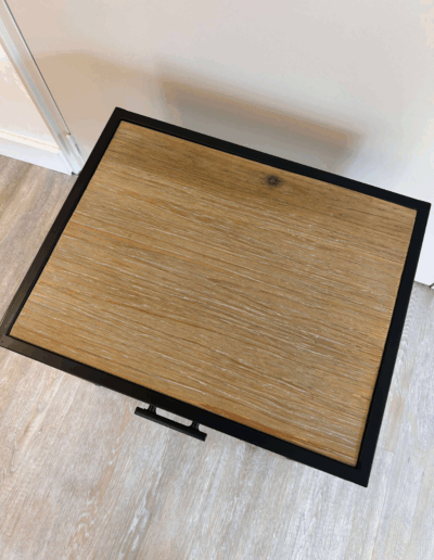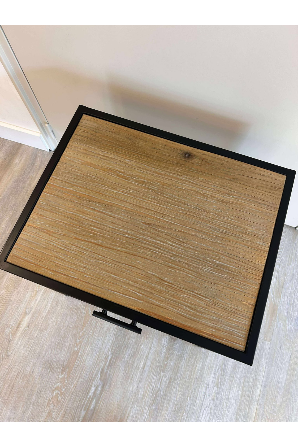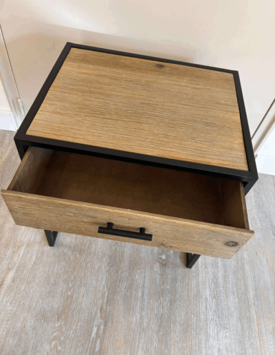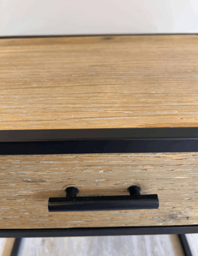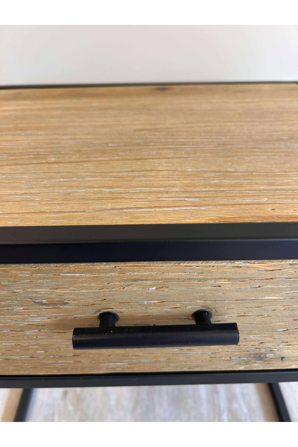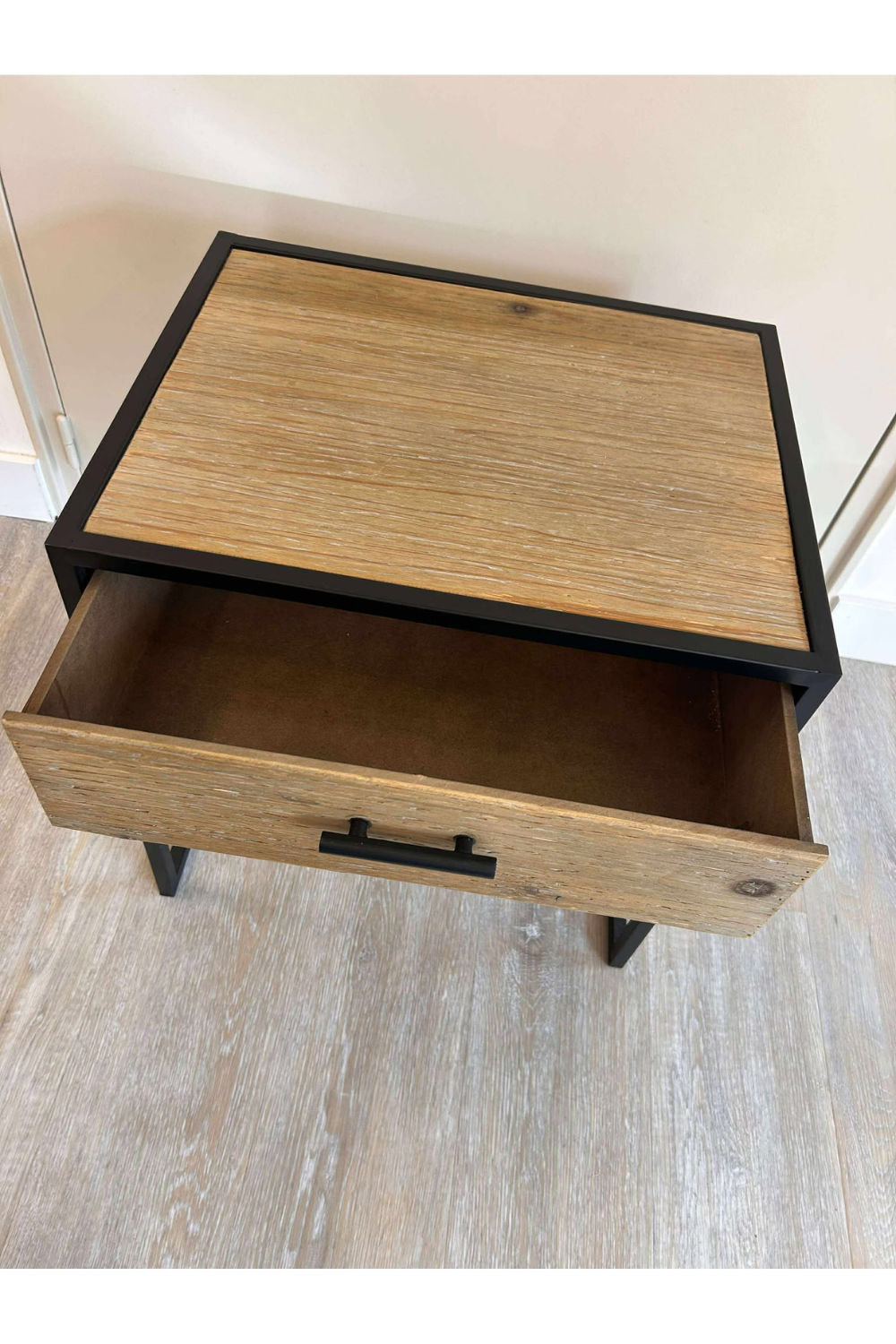 Table de chevet avec un tiroir, structure en métal noir et bois.