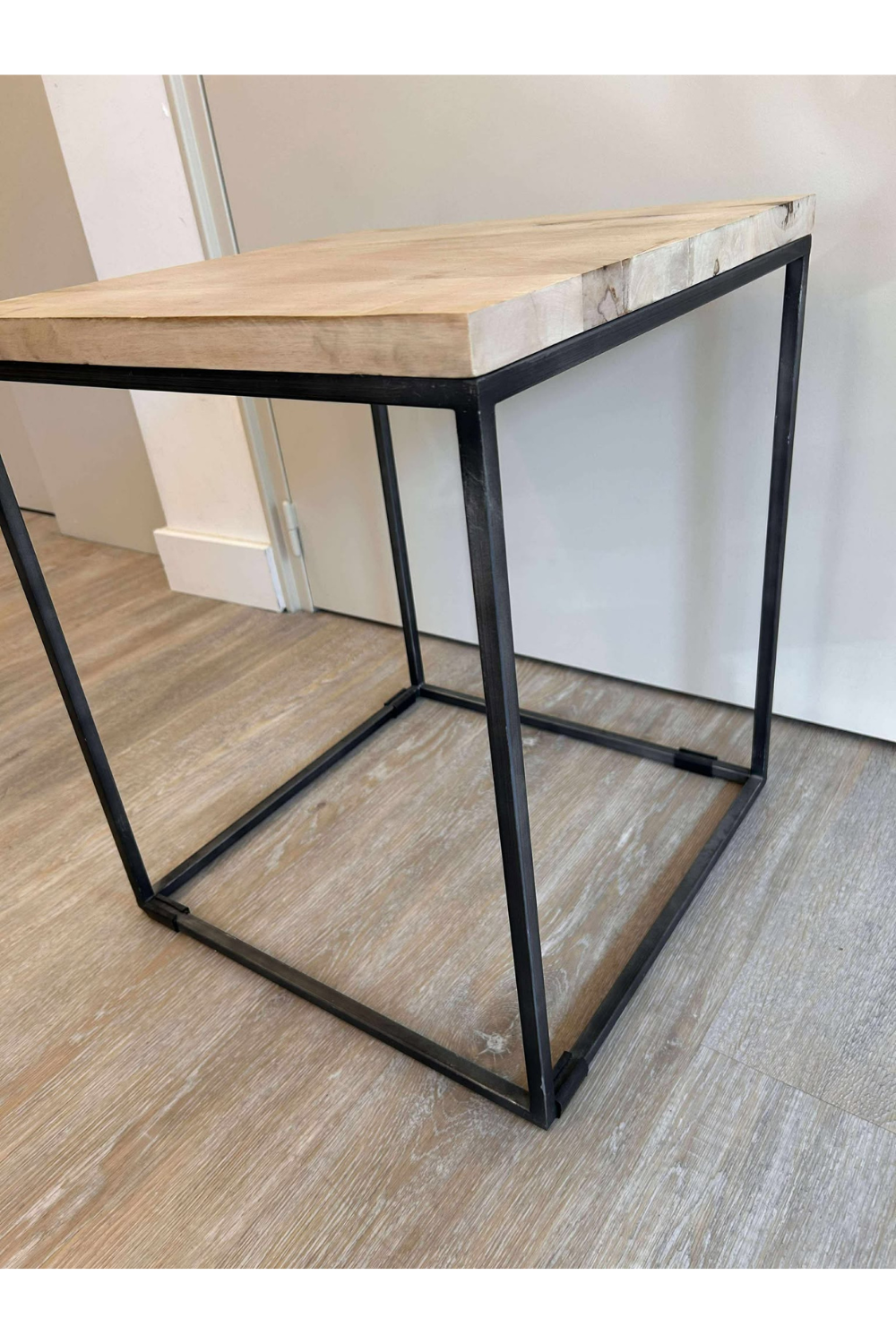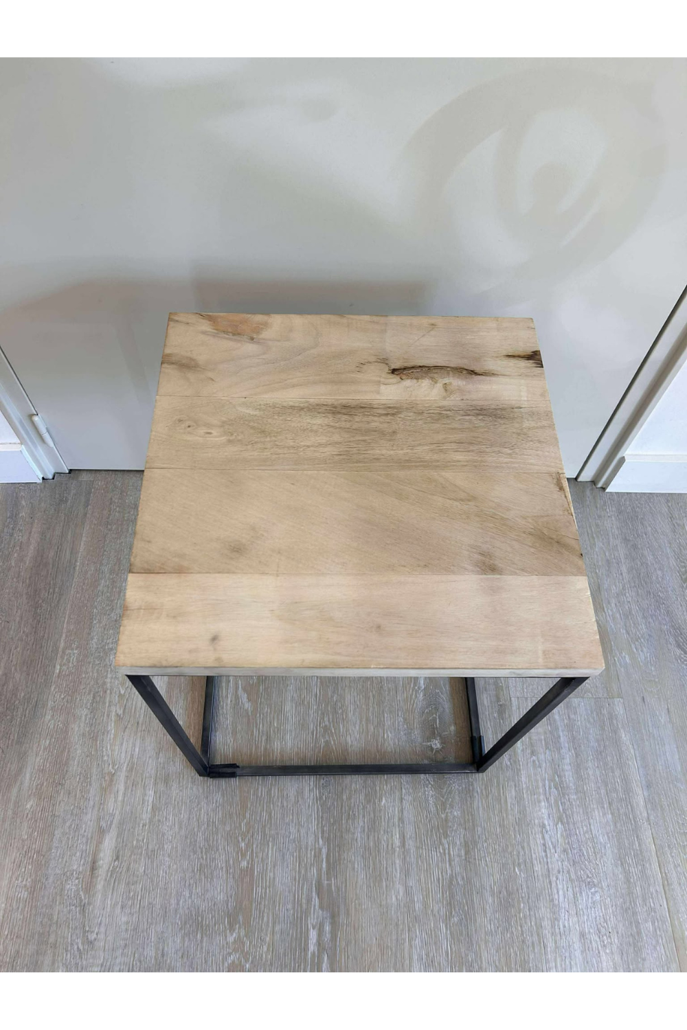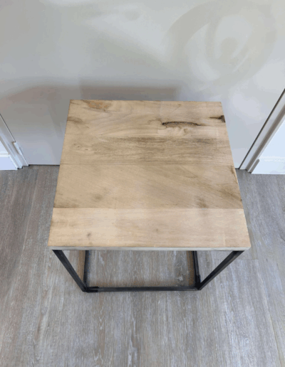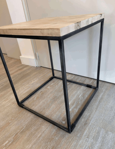 Table d’appoint avec une structure en métal noir et plateau en bois.