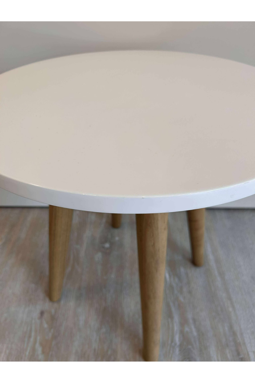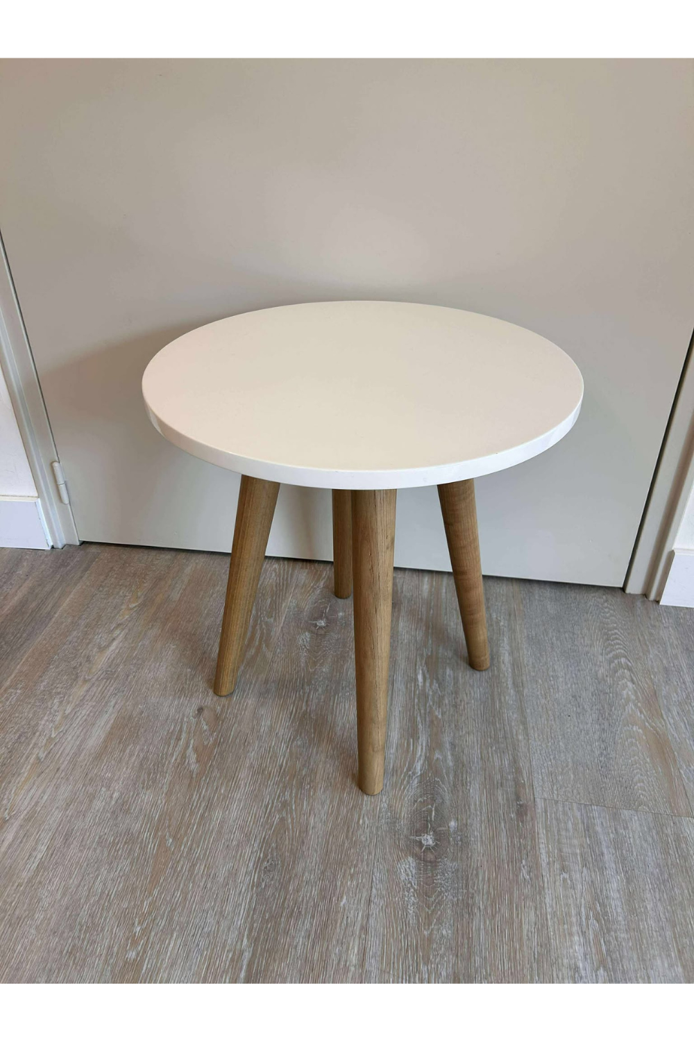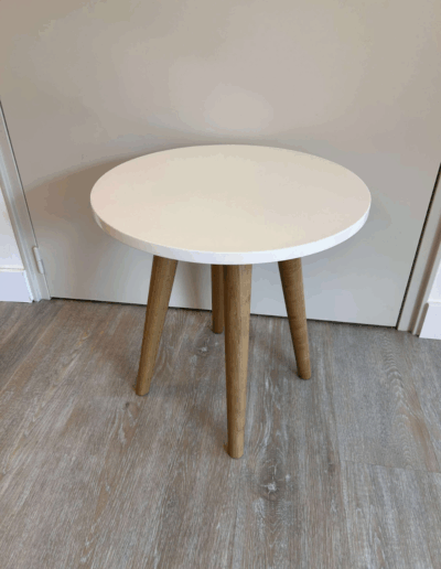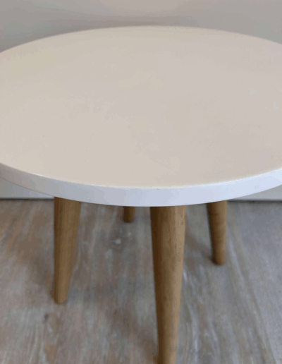 Table ronde avec plateau laqué blanc et trépied en bois.